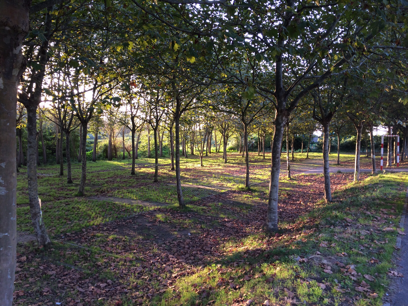 Breakfast at the apartment had been a heavy, store-bought tortilla, never again, and instant coffee. The local restaurant had at least one Michelin star, and the plats principaux were €40 a pop, so we gave them a miss, and brought food at the little store. And on the way we passed a park, bathed in the evening light.
